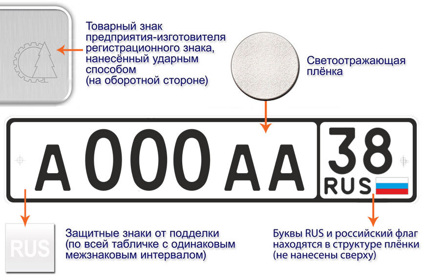 - регистрационные знаки имеют световозвращающее покрытие и имеют элементы защиты от подделки, включенные в структуру покрытия, в виде повторяющихся через интервал надписей RUS.